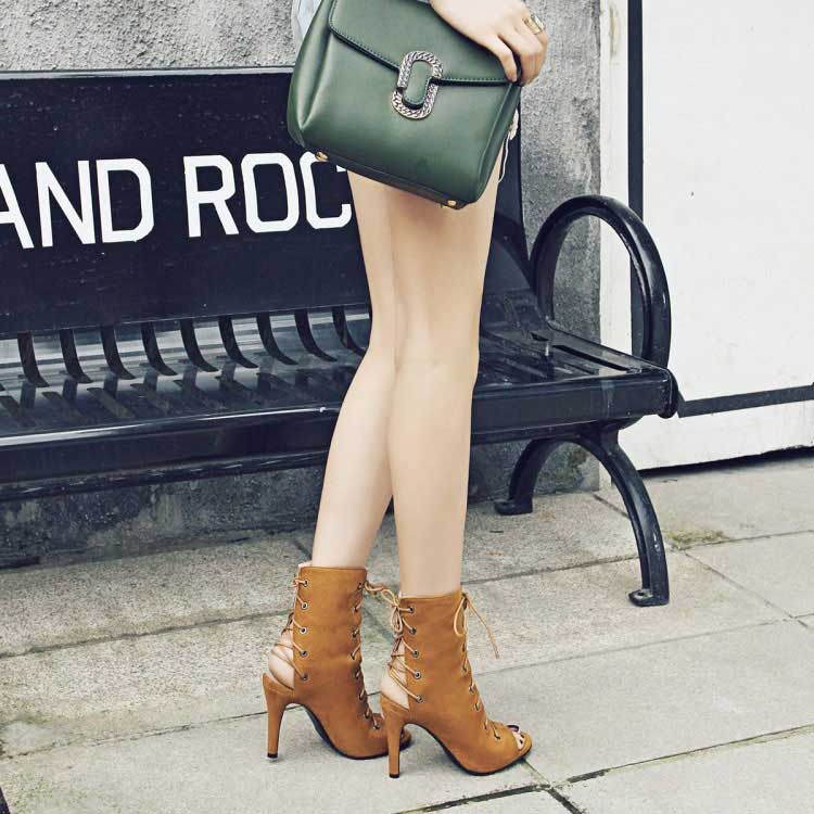 The front lace-up design provides a customizable fit and adds an element of interest to these stylish booties. The peep-toe feature allows you to flaunt your pedicure. making these shoes perfect for all seasons. With a towering 10cm heel. these booties offer an ultra-high lift that elongates your legs. enhancing your overall silhouette while still providing stability thanks to the sturdy rubber sole.