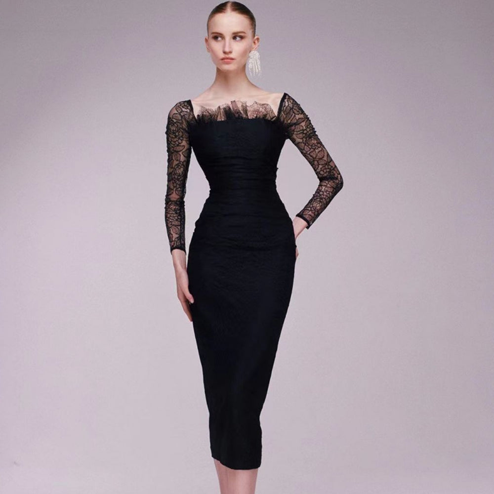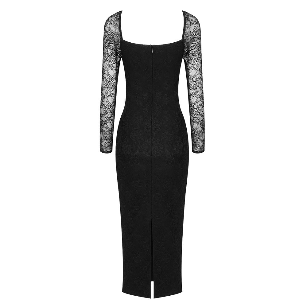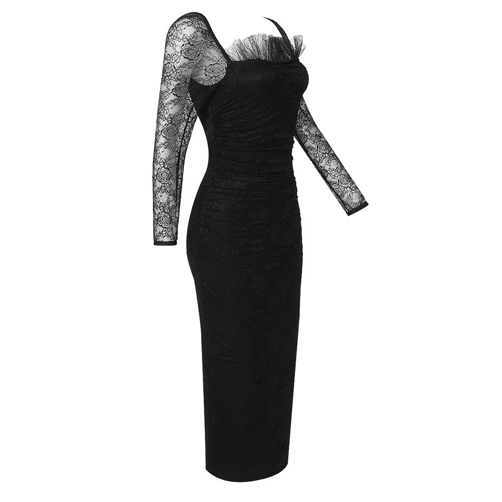 Square Collar Long Sleeve Midi Frill Bodycon Dress