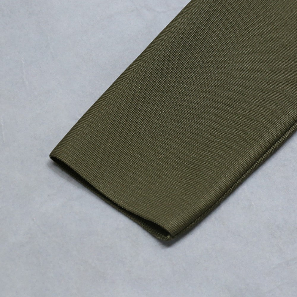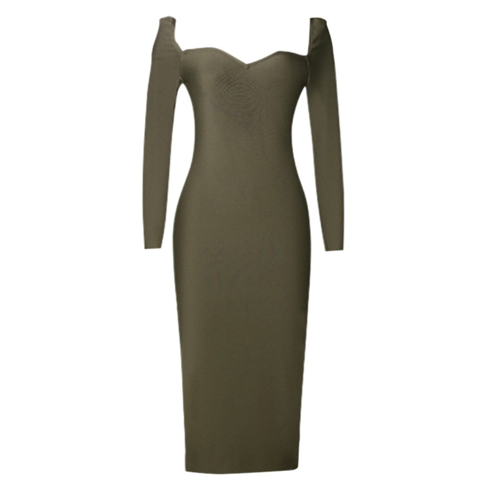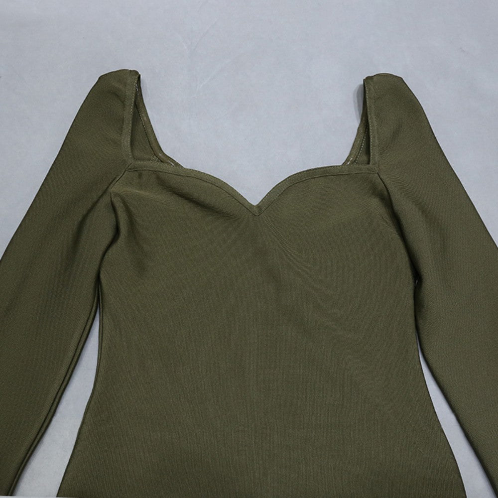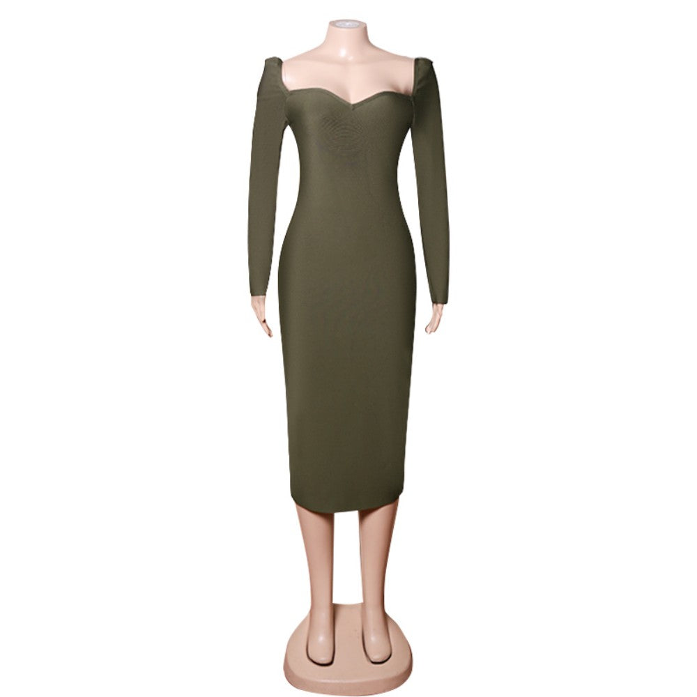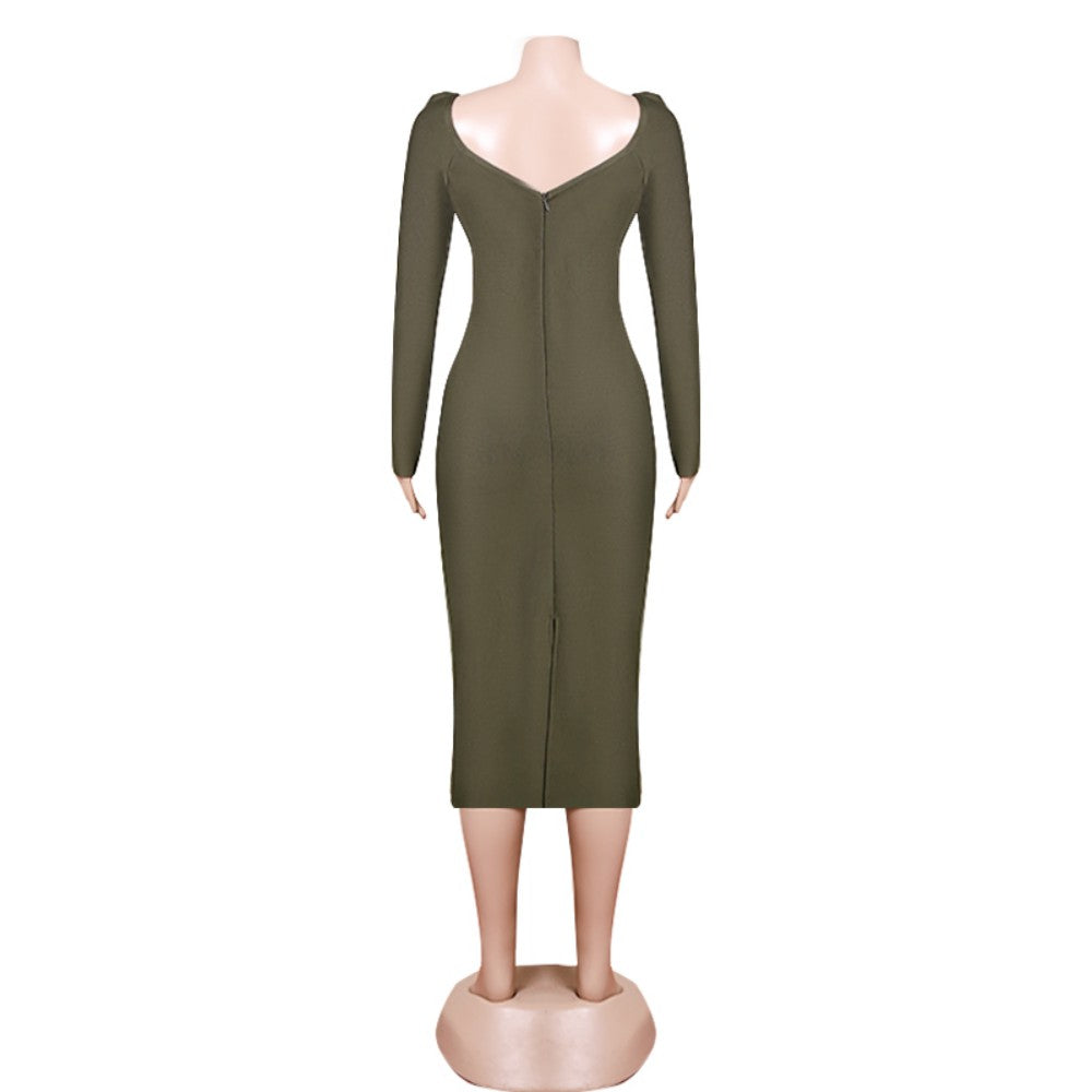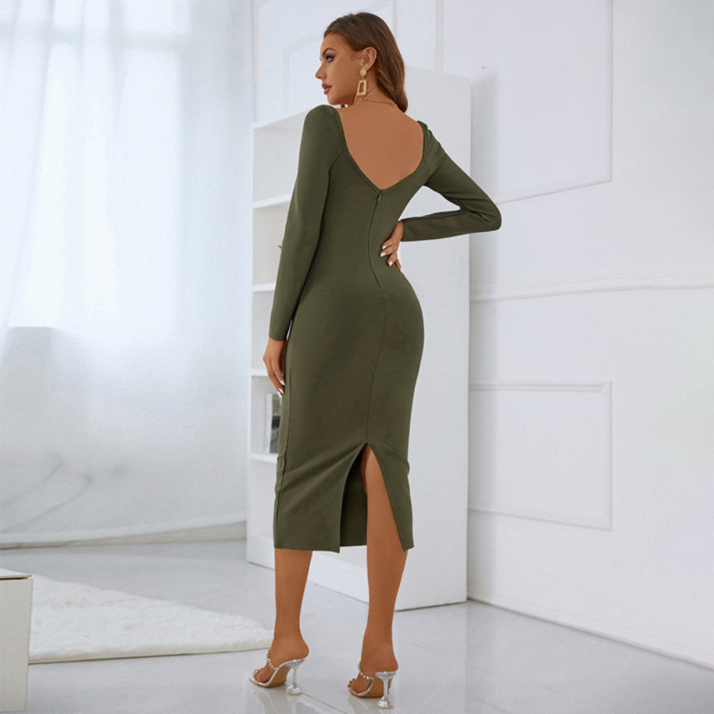 Square Collar Long Sleeve Midi Plain Bandage Dress