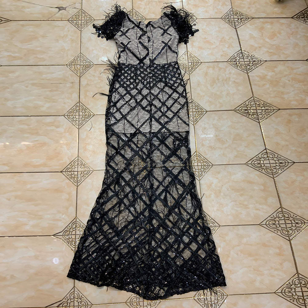 Square Collar Short Sleeve Maxi Mesh Bodycon Dress