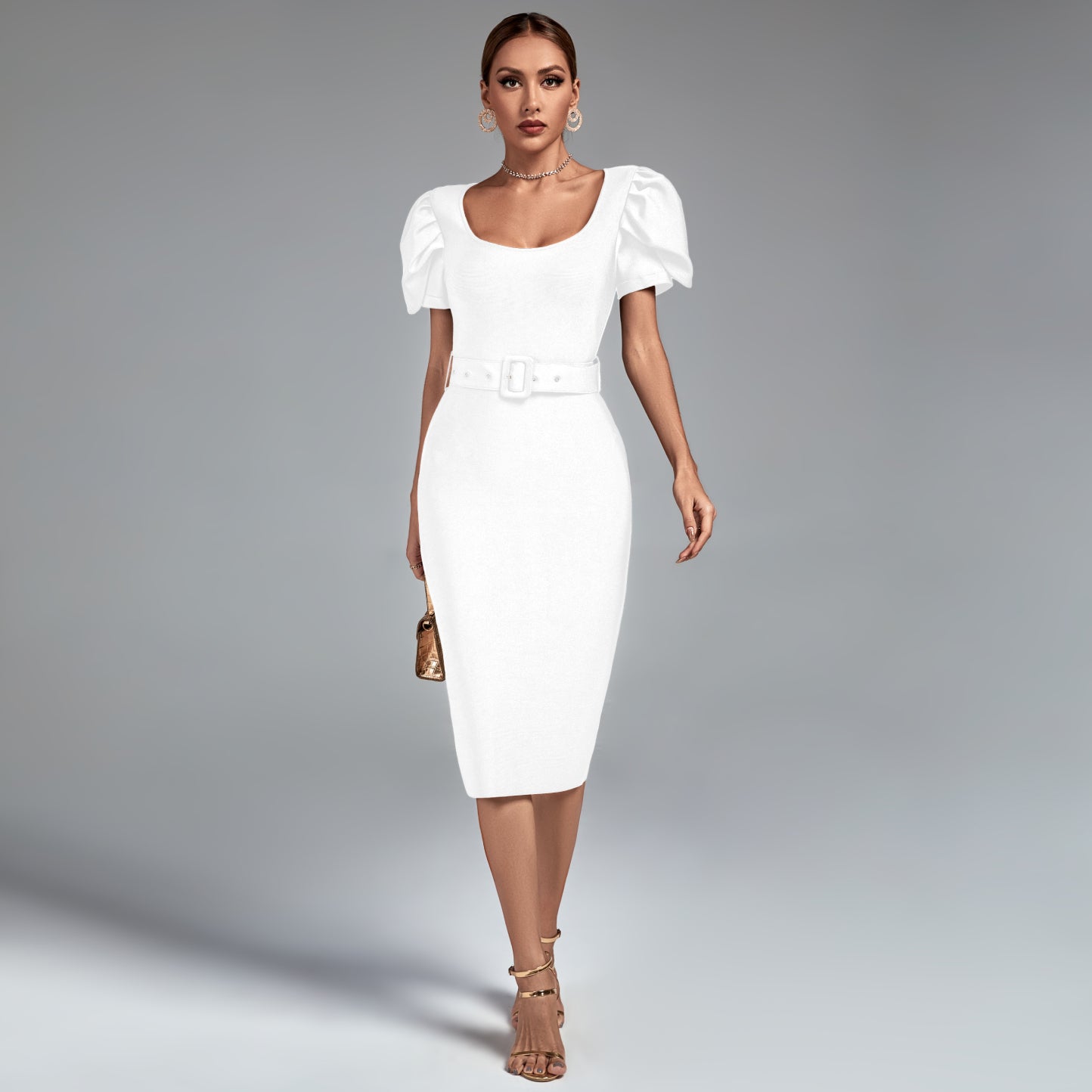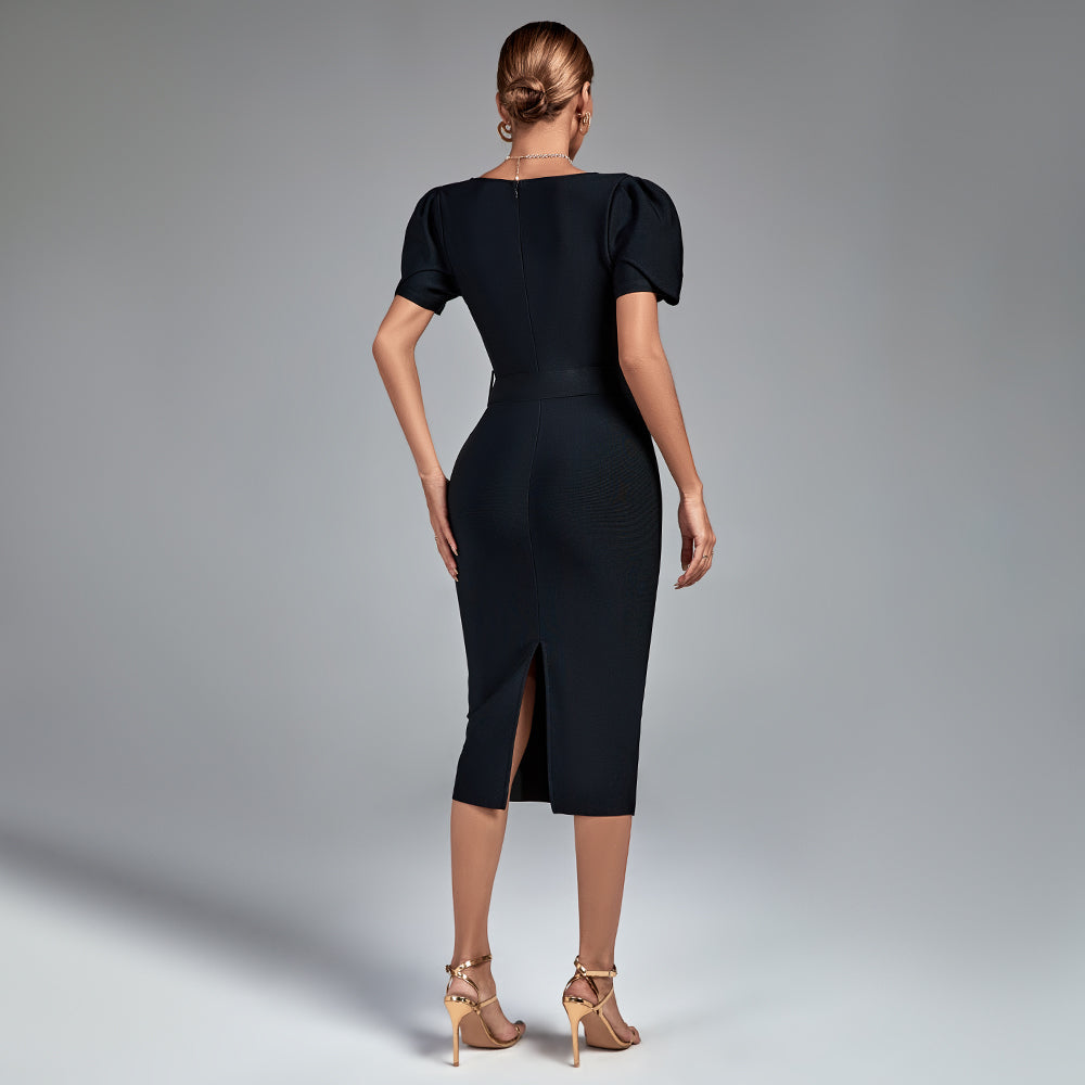 Square Collar Short Sleeve Midi Bandage Dress