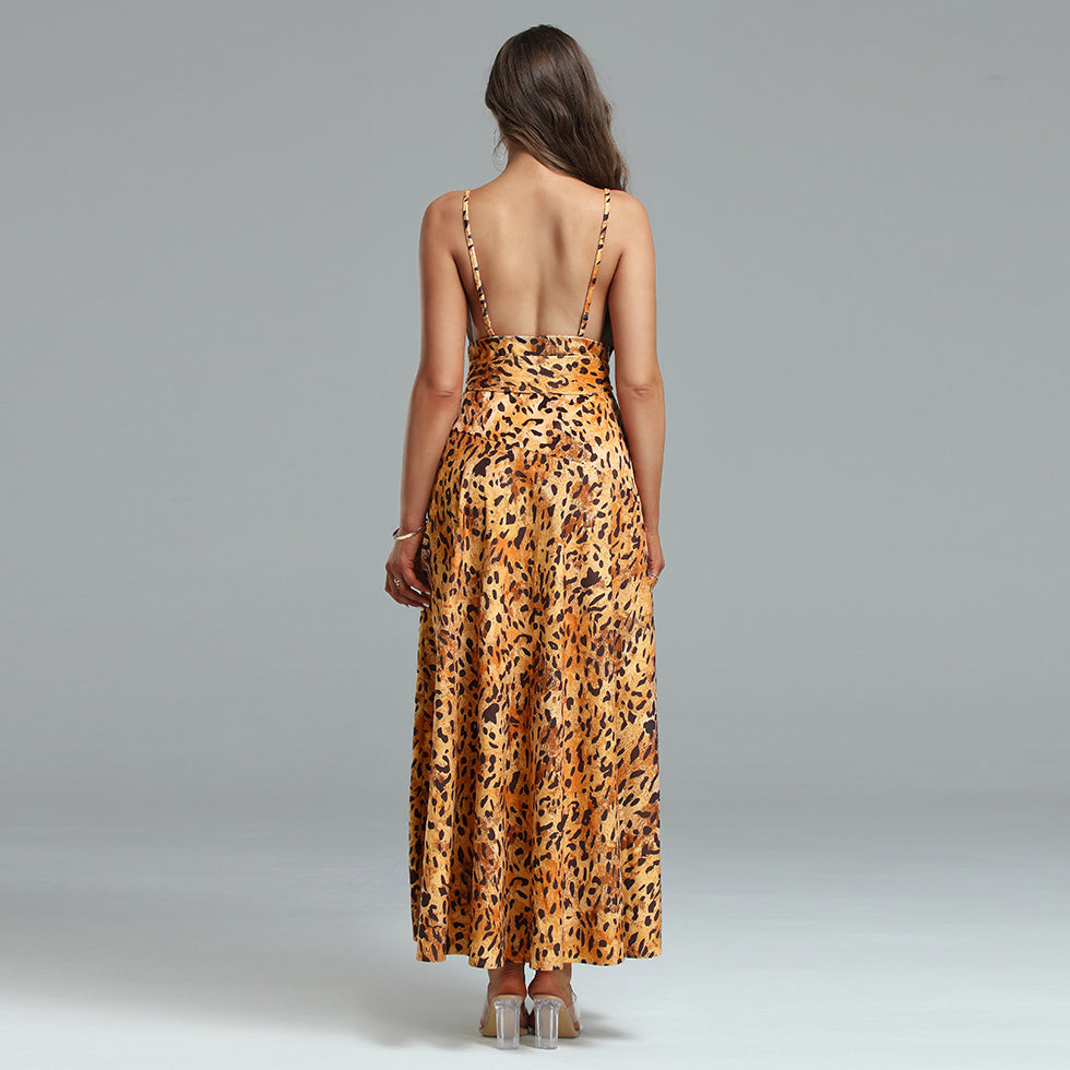 Unleash your wild side with this bold and daring strappy leopard print maxi dress! Featuring an adjustable belt and sultry straps. this dress is perfect for an adventure-filled night out. Make a statement and own the night!