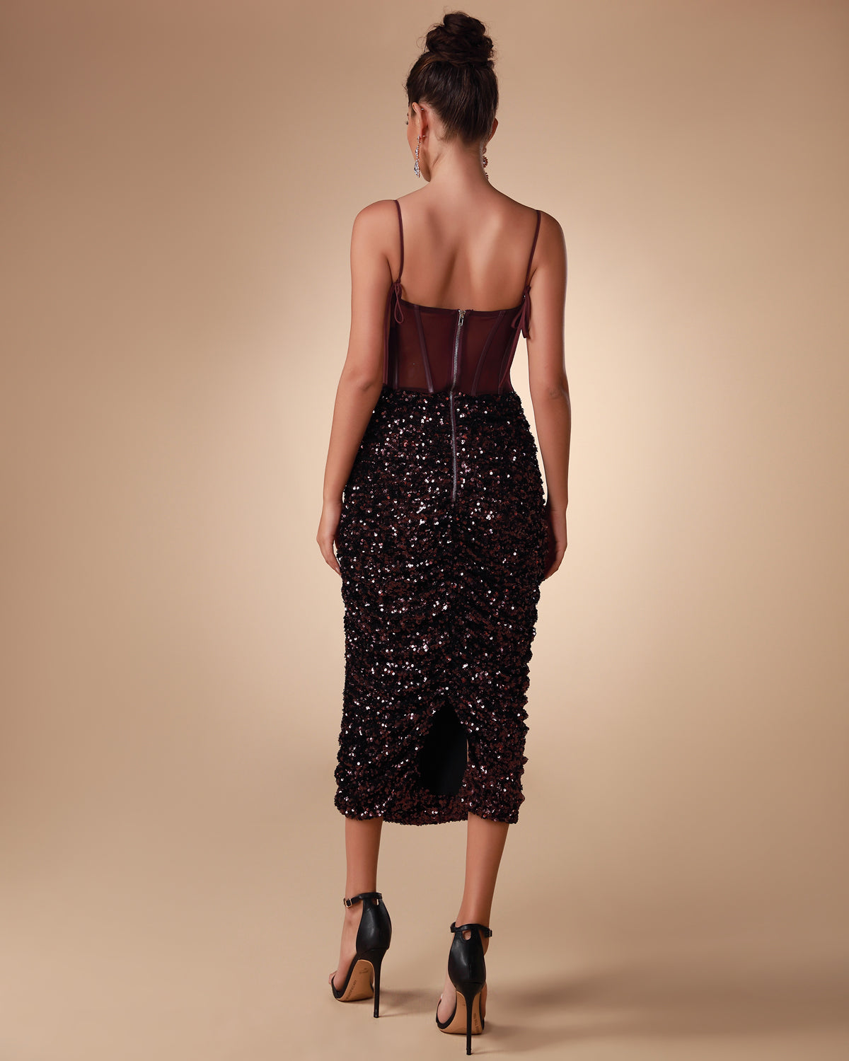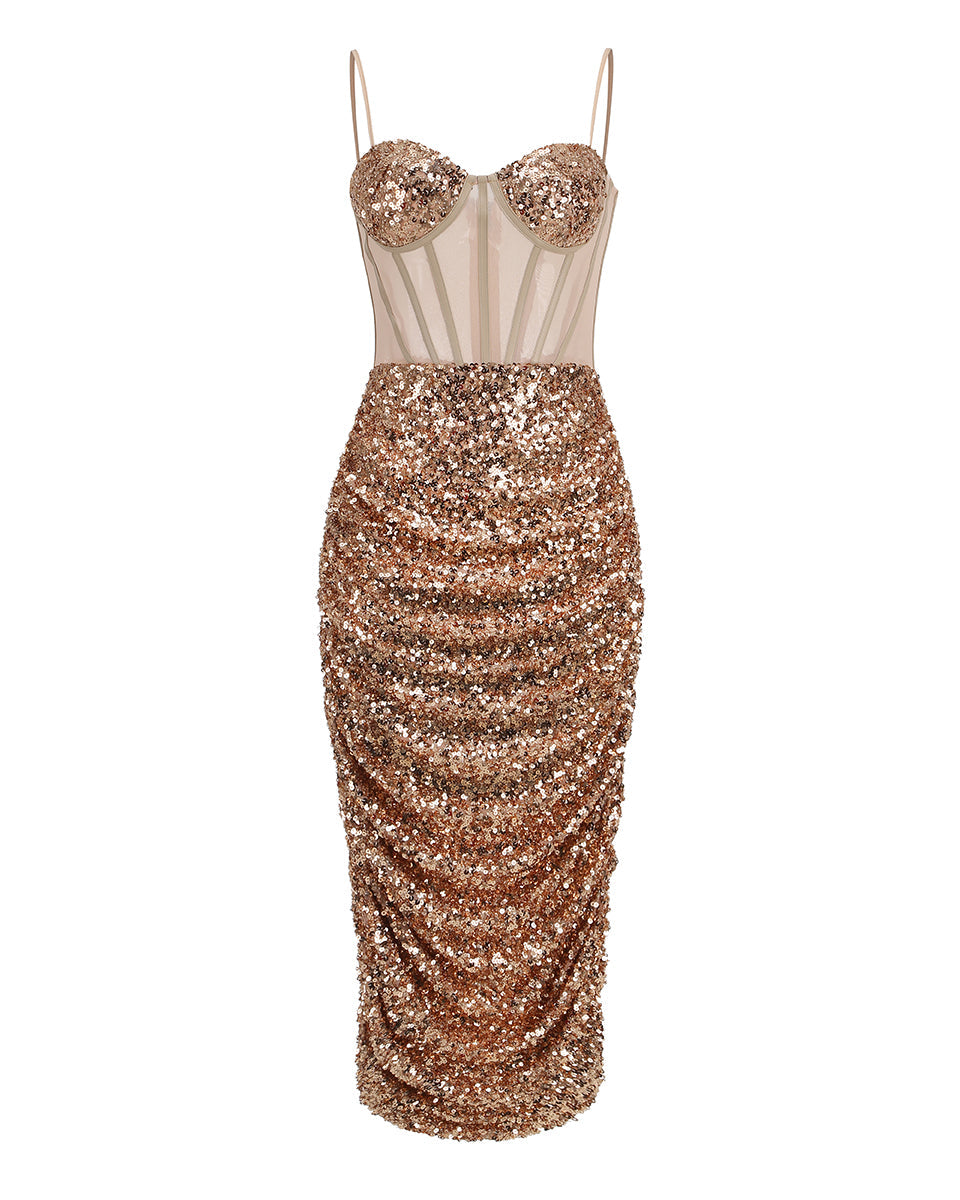 This sophisticated Strappy Sequin Corset Midi Dress features a beautiful sequin fabrication and a waist cinching. net lace-up corset with fishbone details. Perfect for special occasions. its timeless style will have you turning heads all night.
