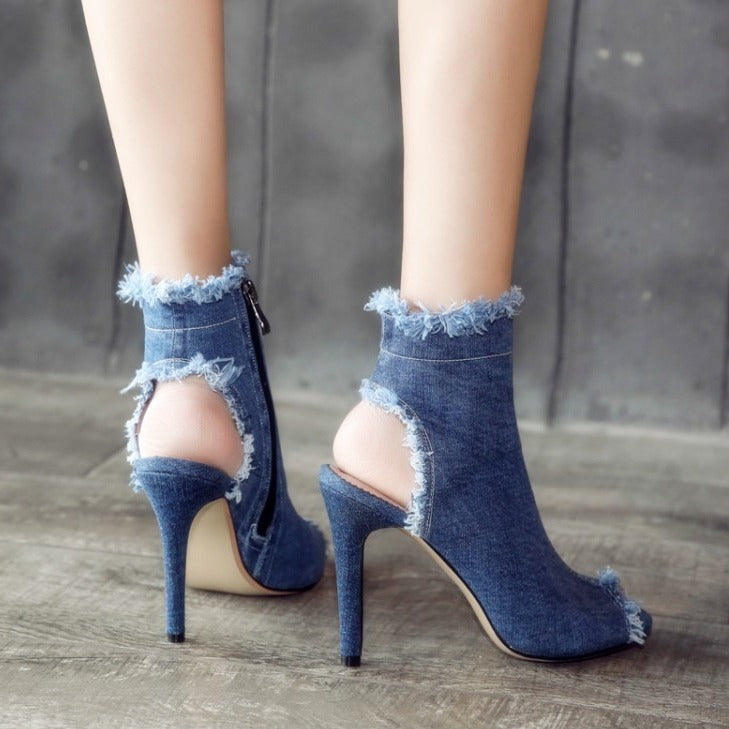 Are you ready to turn heads and break norms? Embrace your inner trendsetter and make these Denim Peep-Toe Booties yours today. Click to buy now and step out in style every time you walk out the door. Don't just walk—strut. Your new favorite booties are just a click away!
