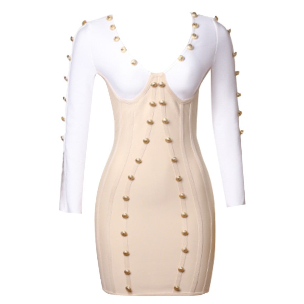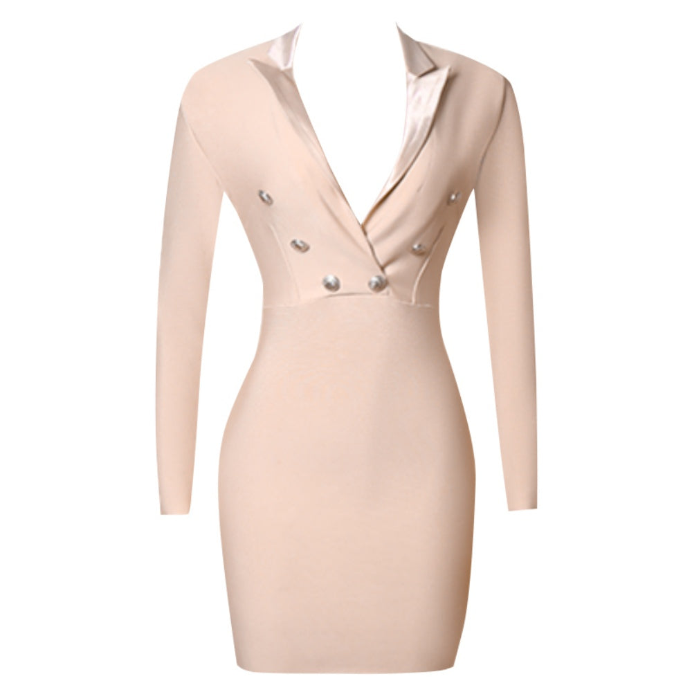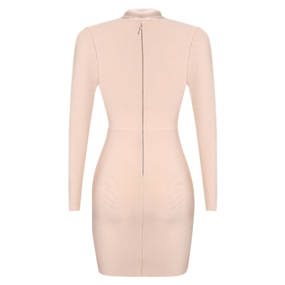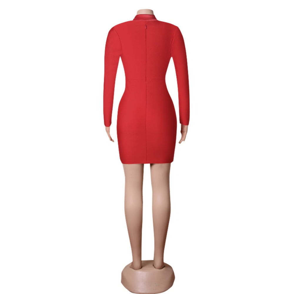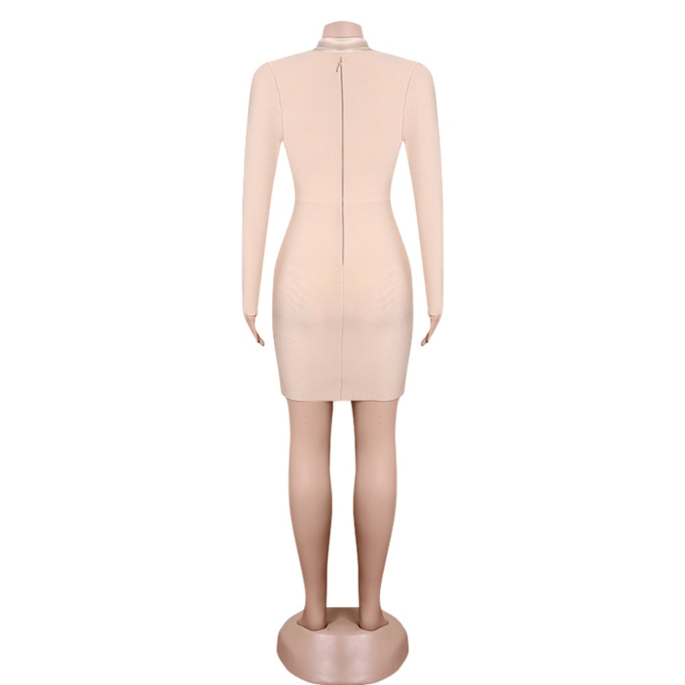 V Neck Long Sleeve Mini Metal Ornamental Buckle Bandage Dress