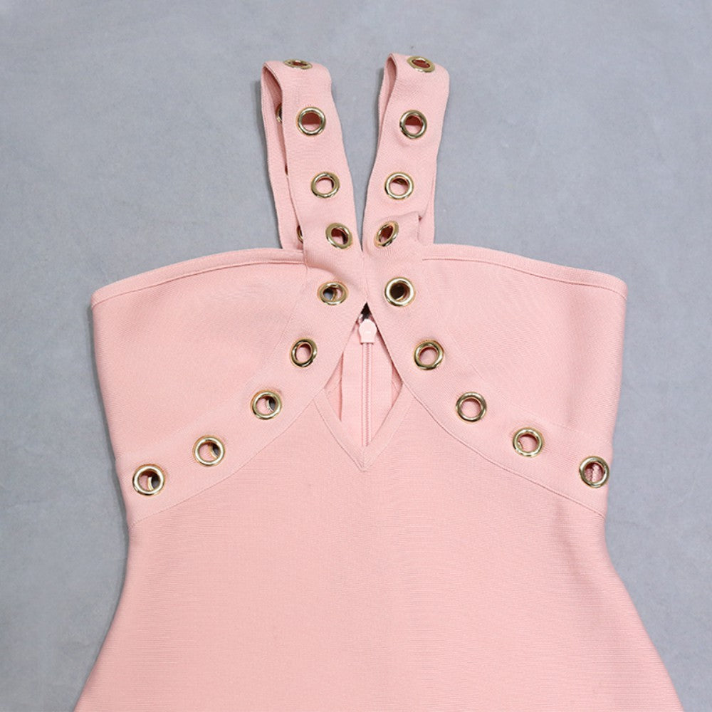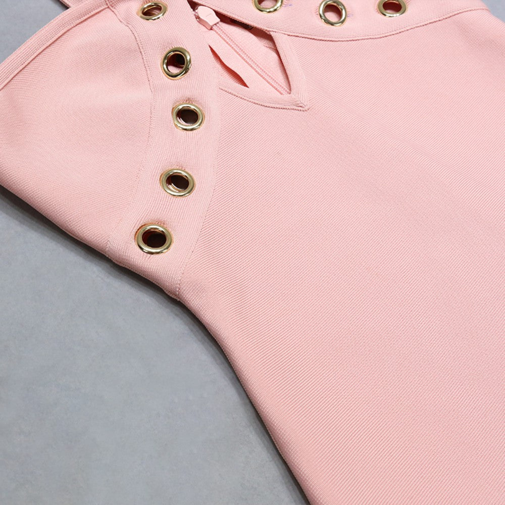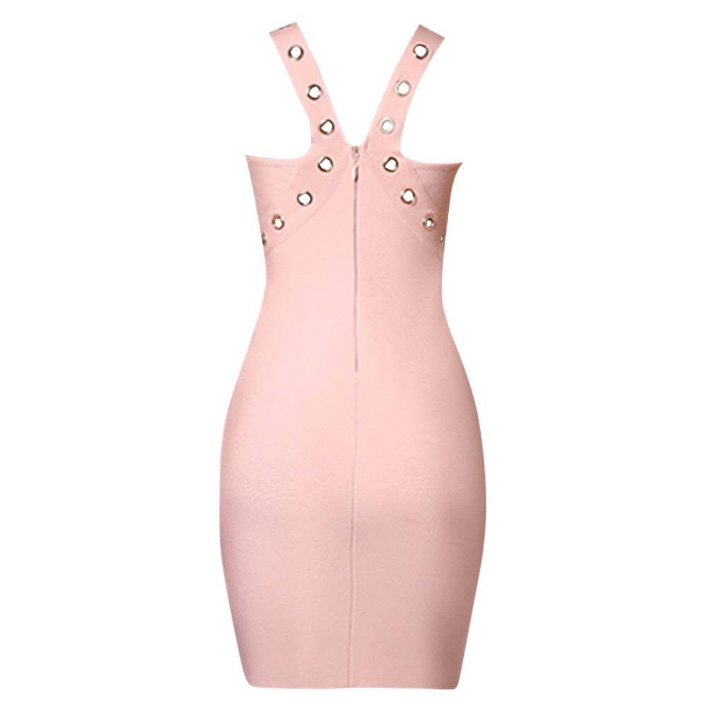 V Neck Sleeveless Midi Metal Studded Bandage Dress