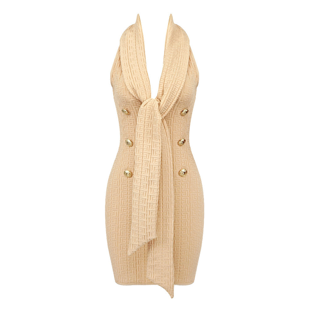 V Neck Mini Metal Ornamental Buckle Bodycon Dress