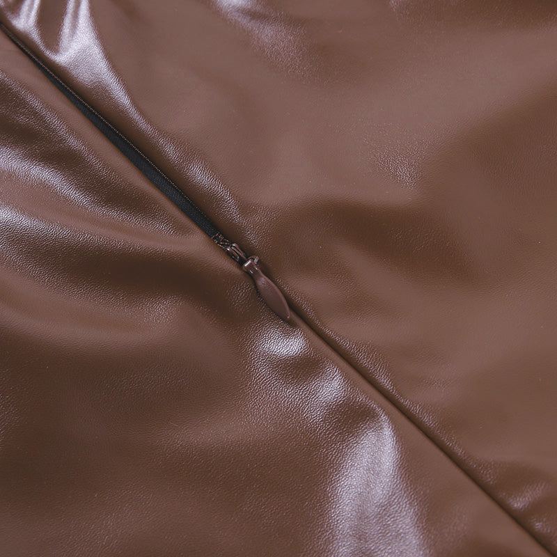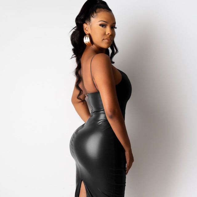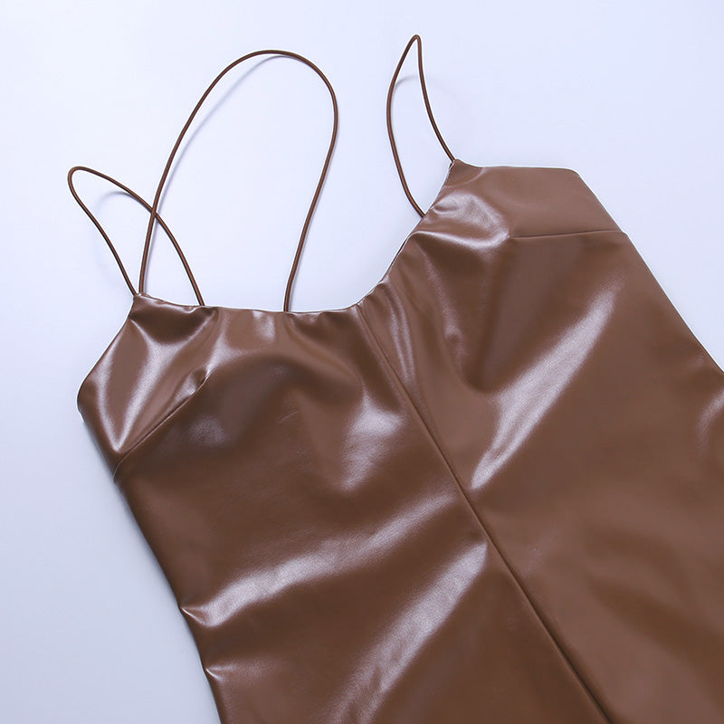 Exclusively designed by us for you. Brining you our most loved body. in all new Leather fabric! An on trend leather with a flattering bodice. and a unique cut all at the same time! Plunging neckline with thin elastic straps and a stand out detail diagonal strap across the top. Super soft with stretch.